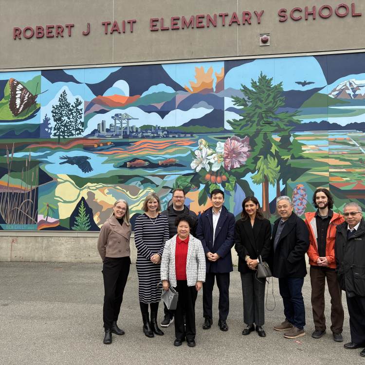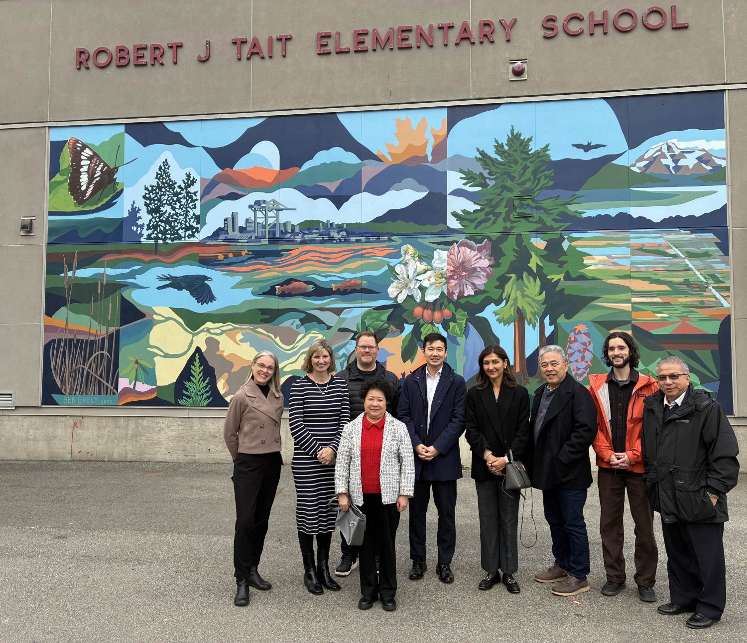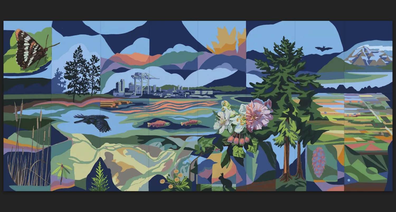 The mural showcases a spectrum of the natural world local to Richmond, and to the area around R.J Tait Elementary. The elements are based on the most frequently tallied responses from the students on engagement worksheets. The mural also focuses of native species integral to the local area. The result is largely representative of what came to mind for the students, while also including some local elements which may be less familiar, or a unique vantage point on a familiar sight.