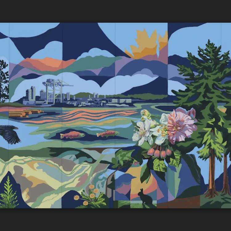 The flow of the Fraser River is the central to the mural concept and connects the various elements in the composition. Mountains, trees, forests and the river were the most prominent outdoor themes which emerged from the student engagement. Students recalled hanging out at parks near the river, the cool breeze, the many plants and animals on the riverside, and North Shore mountains in the distance. In the lower left section of the mural, common